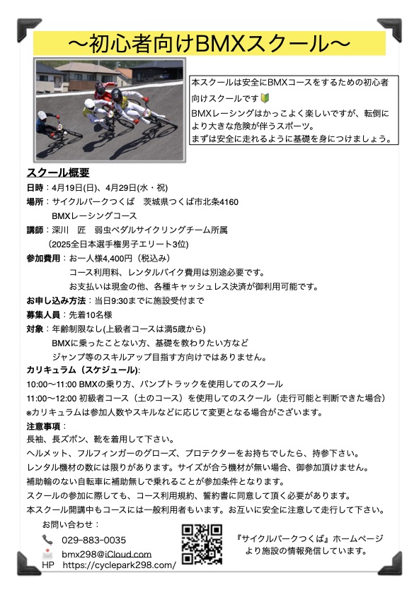 4月初心者向けBMXスクール開催日をお知らせいたします。