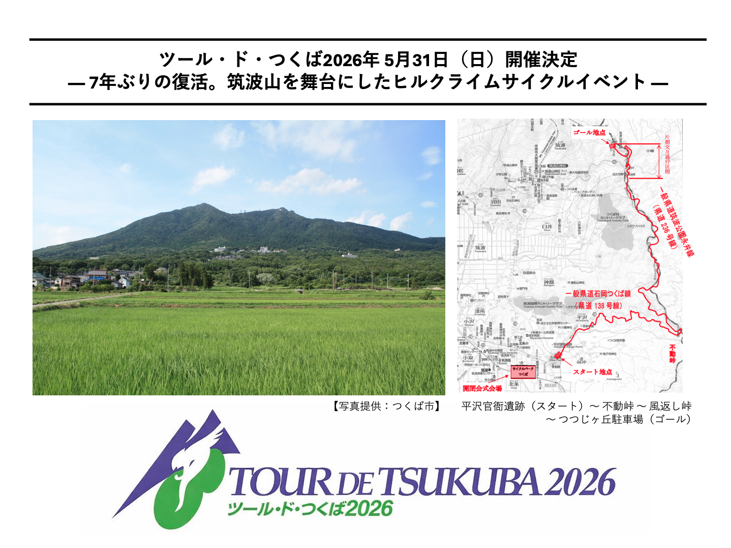 ツール・ド・つくば2026実行委員会(所在地:茨城県つくば市)は、日本百名山・筑波山を舞台としたヒルクライムサイクルイベント「ツール・ド・つくば2026」を、2026年5月31日(日)に開催いたします!