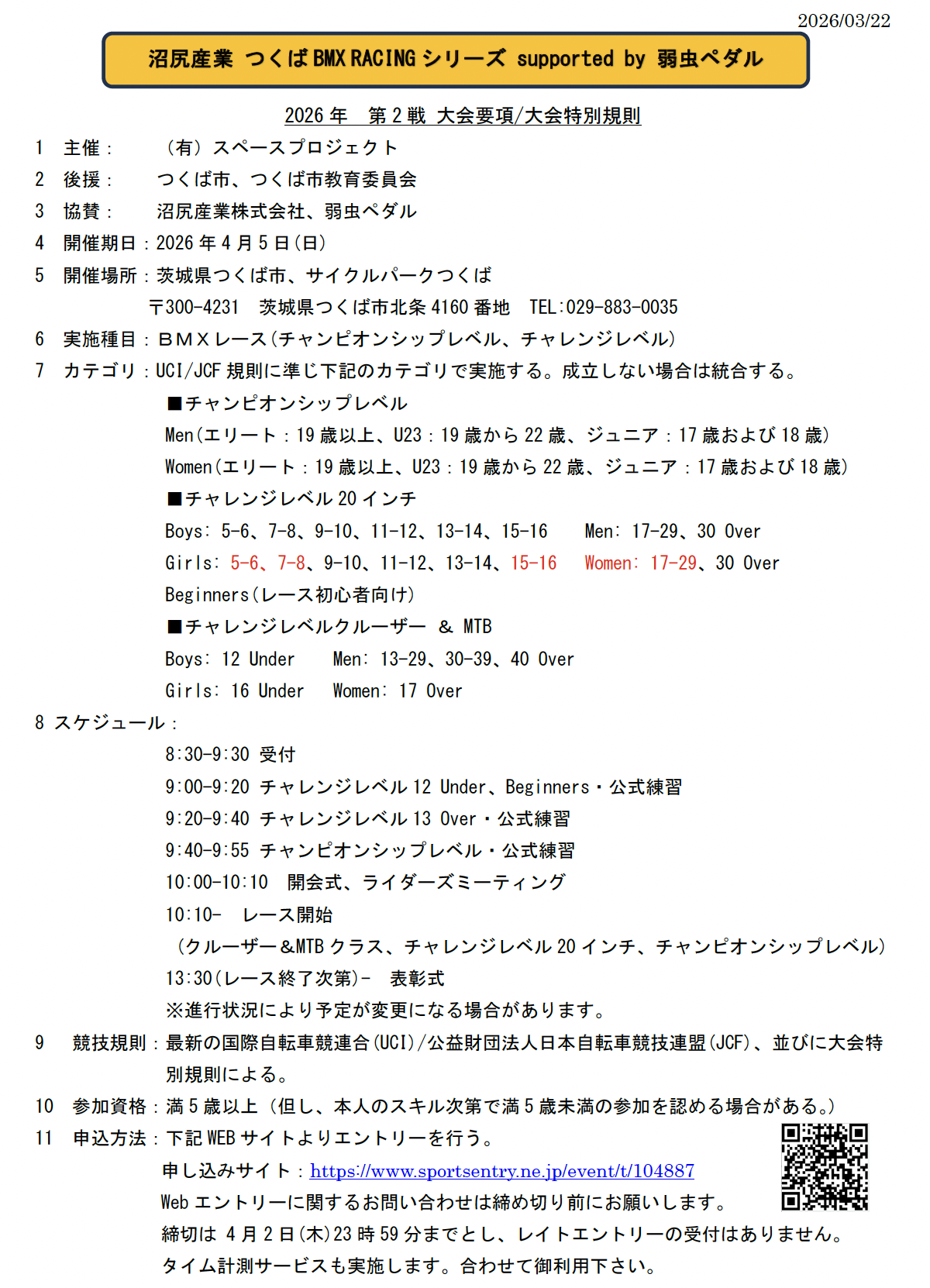 開幕戦が終了したばかりですが、『沼尻産業 つくば BMX RACING シリーズ supported by 弱虫ペダル』2026年 第2戦のエントリーを開始しました。本格的なレースシーズンスタートに際し奮って御参加下さい。